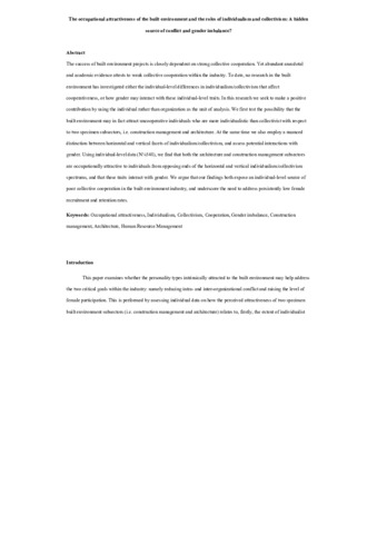 The success of built environment projects is closely dependent on strong collective cooperation. Yet abundant anecdotal and academic evidence attests to weak collective cooperation within the industry. To date, no research in the built environment has investigated either the individual-level differences in individualism/collectivism that affect cooperativeness, or how gender may interact with these individual-level traits. In this research we seek to make a positive contribution by using the individual rather than organization as the unit of analysis. We first test the possibility that the built environment may in fact attract uncooperative individuals who are more individualistic than collectivist with respect to two specimen subsectors, i.e. construction management and architecture. At the same time we also employ a nuanced distinction between horizontal and vertical facets of individualism/collectivism, and assess potential interactions with gender. Using individual-level data (N¼548), we find that both the architecture and construction management subsectors are occupationally attractive to individuals from opposing ends of the horizontal and vertical individualism/collectivism spectrums, and that these traits interact with gender. We argue that our findings both expose an individual-level source of poor collective cooperation in the built environment industry, and underscore the need to address persistently low female recruitment and retention rates.