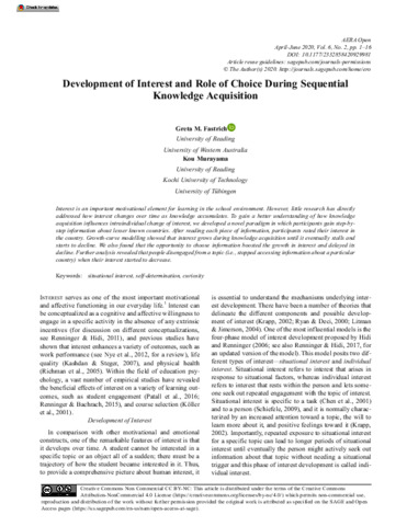 Fastrich, G. and Murayama, K. (2020) Development of interest and role of choice during sequential knowledge acquisition. AERA Open, 6 (2). pp. 1-16. ISSN 2332-8584 doi: 10.1177/2332858420929981