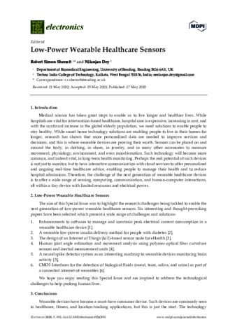 Sherratt, R. S. orcid id iconORCID: https://orcid.org/0000-0001-7899-4445 and Dey, N. (2020) Low-power wearable healthcare sensors. Electronics, 9 (6). 892. ISSN 2079-9292 doi: 10.3390/electronics9060892 (Special Issue: Low-power Wearable Healthcare Sensors)