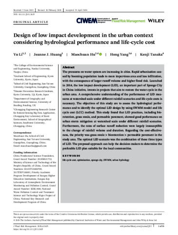 Li, Y., Huang, J. J., Hu, M., Yang, H. orcid id iconORCID: https://orcid.org/0000-0001-9940-8273 and Tanaka, K. (2020) Design of low impact development in the urban context considering hydrological performance and life-cycle cost. Journal of Flood Risk Management, 13 (3). ISSN 1753-318X doi: 10.1111/jfr3.12625