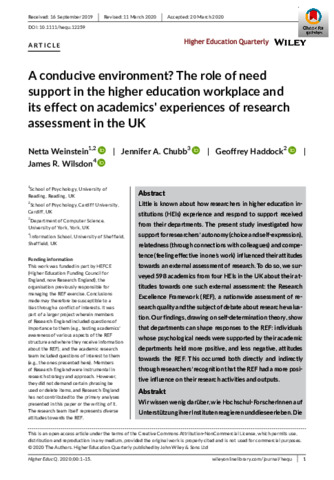Weinstein, N. orcid id iconORCID: https://orcid.org/0000-0003-2200-6617, Chubb, J. A., Haddock, G. and Wilsdon, J. R. (2021) A conducive environment? The role of need support in the higher education workplace and its effect on academics' experiences of research assessment in the UK. Higher Education Quarterly, 75 (1). pp. 146-160. ISSN 1468-2273 doi: 10.1111/hequ.12259