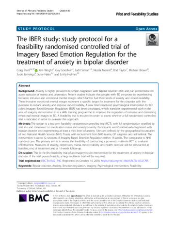 Steel, C., Wright, K., Ggoodwin, G., Simon, J., Morant, N., Taylor, R., Brown, M., Jennings, S., Hales, S. and Holmes, E. (2020) The IBER study: study protocol for a feasibility randomised controlled trial of Imagery Based Emotion Regulation for the treatment of anxiety in bipolar disorder. Pilot and feasibility studies, 6 (1). 83. ISSN 2055-5784 doi: 10.1186/s40814-020-00628-8