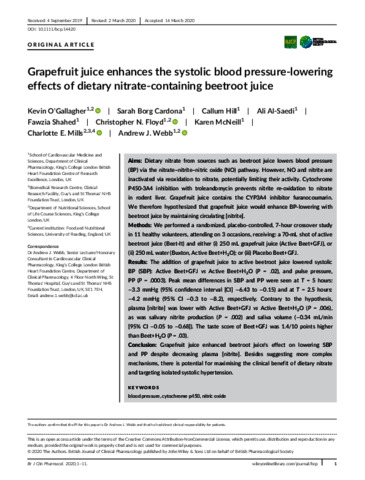 Aims: Dietary nitrate from sources such as beetroot juice lowers blood pressure (BP) via the nitrate-nitrite-nitric oxide (NO) pathway. However, NO and nitrite are inactivated via re- oxidation to nitrate, potentially limiting their activity. Cytochrome P450-3A4 inhibition with troleandomycin prevents nitrite re-oxidation to nitrate in rodent liver. Grapefruit juice contains the CYP3A4 inhibitor furanocoumarin. We therefore hypothesized that grapefruit juice would enhance BP-lowering with beetroot juice by maintaining circulating [nitrite]. Methods: We performed a randomized, placebo-controlled, 7-hour crossover study in 11 healthy volunteers, attending on 3 occasions, receiving: a 70ml-shot of active beetroot juice (Beet- It®) and either (i) 250 ml grapefruit juice (“Active Beet+GFJ”), or (ii) 250 ml water (Buxton®, “Active Beet+H2O”); or (iii) Placebo Beet+GFJ. Results: The addition of grapefruit juice to active beetroot juice lowered systolic BP (SBP): Active Beet+GFJ versus Active Beet+H2O (P=0.02), and pulse pressure, PP (P=0.0003). Peak mean differences in SBP and PP were seen at T=5 hours: -3.3mmHg (95% CI -6.43 to -0.15) and at T=2.5 hours: -4.2 mmHg (95% CI -0.3 to -8.2), respectively. Contrary to the hypothesis, plasma [nitrite] was lower with Active Beet+GFJ versus Active Beet+H2O (P=0.006), as was salivary nitrite production (P=0.002) and saliva volume (-0.34 ml/min (95% CI -0.05 to - 0.68)). The taste score of Beet+GFJ was 1.4/10 points higher than Beet+H2O (P=0.03). This article is protected by copyright. All rights reserved. Conclusions: Grapefruit juice enhanced beetroot juice’s effect on lowering SBP and PP despite decreasing plasma [nitrite]. Besides suggesting more complex mechanisms, there is potential for maximising the clinical benefit of dietary nitrate and targeting isolated systolic hypertension.