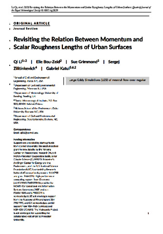 Li, Q., Bou‐Zeid, E., Grimmond, S. orcid id iconORCID: https://orcid.org/0000-0002-3166-9415, Zilitinkevich, S. and Katul, G. (2020) Revisiting the relation between momentum and scalar roughness lengths of urban surfaces. Quarterly Journal of the Royal Meteorological Society, 146 (732). pp. 3144-3164. ISSN 1477-870X doi: 10.1002/qj.3839