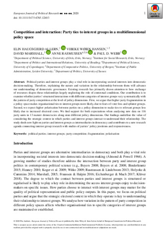 Political parties and interest groups play a vital role in incorporating societal interests into democratic decision-making. Therefore, explaining the nature and variation in the relationship between them will advance our understanding of democratic governance. Existing research has primarily drawn attention to how exchange of resources shapes these relationships largely neglecting the role of contextual conditions. Our contribution is to examine whether parties’ structured interactions with different categories of interest groups vary systematically with the pattern of party competition at the level of policy dimensions. First, we argue that higher party fragmentation in a policy space makes organisational ties to interest groups more likely, due to fears of voter loss and splinter groups. Second, we expect higher polarisation between parties on a policy dimension to make ties to relevant groups less likely due to increased electoral costs. We find support for both expectations when analysing new data on 116 party units in 13 mature democracies along nine different policy dimensions. Our findings underline the value of considering the strategic context in which parties and interest groups interact to understand their relationship. The study sheds new light on parties and interest groups as intermediaries in democracy and contributes to a new research agenda connecting interest group research with studies ofeli parties’ policy positions and responsiveness.