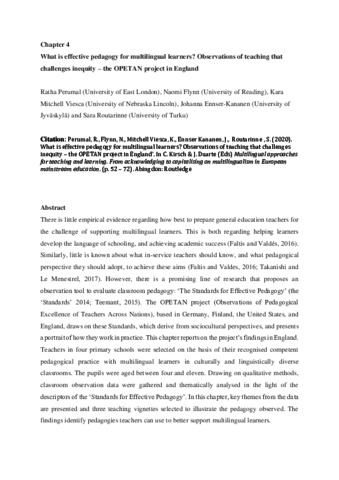 Perumal, R., Flynn, N. orcid id iconORCID: https://orcid.org/0000-0002-3710-9910, Mitchell Viesca, K., Ennser-Kananen, H. and Routarinne, S. (2020) What is effective pedagogy for multilingual learners? Observations of teaching that challenges inequity. The OPETAN project in England. In: Kirsch, C. and Duarte, J. (eds.) Multilingual Approaches for Teaching and Learning. From Acknowledging to Capitalising on Multilingualism in European Mainstream Education. Routledge Research in Languages Education. Routledge, pp. 52-72. ISBN 9780367181352