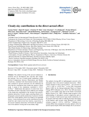 Myhre, G., Samset, B. H., Mohr, C. W., Alterskjær, K., Balkanski, Y., Bellouin, N. orcid id iconORCID: https://orcid.org/0000-0003-2109-9559, Chin, M., Haywood, J., Hodnebrog, Ø., Kinne, S., Lin, G., Lund, M. T., Penner, J. E., Schulz, M., Schutgens, N., Skeie, R. B., Stier, P., Takemura, T. and Zhang, K. (2020) Cloudy sky contributions to the direct aerosol effect. Atmospheric Chemistry and Physics, 20 (14). ISSN 1680-7316 doi: 10.5194/acp-2019-1051