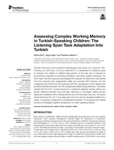 Ünal, G., Özge, D. and Marinis, T. orcid id iconORCID: https://orcid.org/0000-0002-4120-3141 (2020) Assessing complex working memory in Turkish-speaking children: the listening span task adaptation into Turkish. Frontiers in Psychology, 11. ISSN 1664-1078 doi: 10.3389/fpsyg.2020.01688