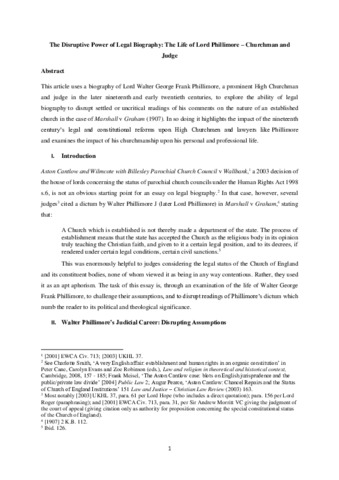 This article uses a biography of Lord Walter George Frank Phillimore, a prominent High Churchman and judge in the later nineteenth and early twentieth centuries, to explore the ability of legal biography to disrupt settled or uncritical readings of his comments on the nature of an established church in the case of Marshall v Graham (1907). In so doing it highlights the impact of the nineteenth century’s legal and constitutional reforms upon High Churchmen and lawyers like Phillimore and examines the impact of his churchmanship upon his personal and professional life.
