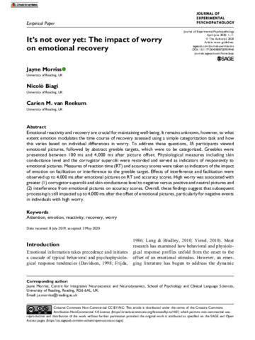 Morriss, J., Biagi, N. and van Reekum, C. M. orcid id iconORCID: https://orcid.org/0000-0002-1516-1101 (2020) It’s not over yet: the impact of worry on emotional recovery. Journal of Experimental Psychopathology, 11 (2). 204380872092994. ISSN 2043-8087 doi: 10.1177/2043808720929940