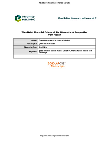 Purpose Since the global financial crisis of 2007-09 academic research has paid considerable attention to understanding the nature of the crisis, its causes and consequences. This is not surprising given the scale and scope of the crisis. Much of this research has been undertaken within social science disciplines. At the same time, the crisis has also been the subject of fiction – novels, poetry and drama and there is also a small body of academic scholarship on fiction relating to the crisis (and on finance in fiction more generally). The purpose of this viewpoint article is to suggest that fiction can offer a new perspective on the global financial crisis and thereby enhance our understanding of it. Design/methodology/approach This exploration draws upon three works of post-crisis fiction: the 2009 play by David Hare, The Power of Yes: A Dramatist Seeks to Understand the Financial Crisis (hereafter The Power of Yes); Other People’s Money, a novel by Justin Cartwright (2011); and Robert Harris’s novel The Fear Index also published in 2011. Its approach is based on close readings of the three texts in question. Findings Finance fiction stimulates a reconceptualization of the global financial crisis as a crisis of innovation and technological change Originality This article is a viewpoint article. The originality lies in the author’s interpretation of reading the global financial crisis through fiction.