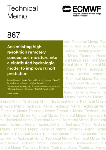 Mason, D. orcid id iconORCID: https://orcid.org/0000-0001-6092-6081, Garcia Pintado, J., Cloke, H. L. orcid id iconORCID: https://orcid.org/0000-0002-1472-868X, Dance, S. orcid id iconORCID: https://orcid.org/0000-0003-1690-3338 and Munoz-Sabater, J., (2020) Assimilating high resolution remotely sensed soil moisture into a distributed hydrologic model to improve runoff prediction. ECMWF Technical Memoranda. 867. Technical Report. ECMWF, Reading, UK. doi: 10.21957/5isuz4a91