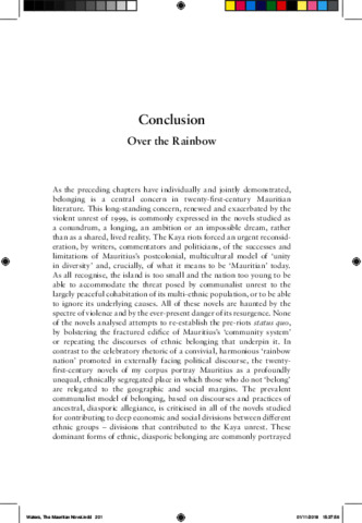 | Additional Information | This is the Conclusion. The full book, entitled: 'The Mauritian Novel: Fictions of Belonging', is referenced on CentAUR here: http://centaur.reading.ac.uk/76132/. |