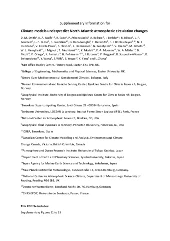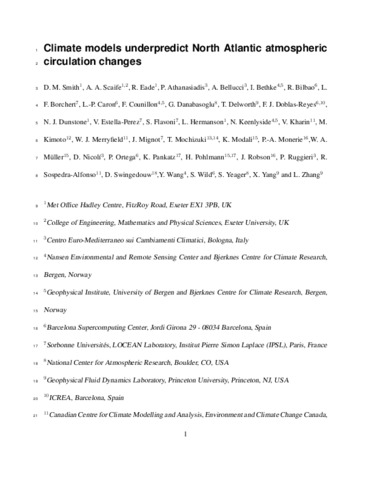 Smith, D. M., Scaife, A. A., Eade, R., Athanasiadis, P., Bellucci, A., Bethke, I., Bilbao, R., Borchert, L. F., Caron, L.-P., Counillon, F., Danabasoglu, G., Delworth, T., Doblas-Reyes, F. J., Dunstone, N. J., Estella-Perez, V., Flavoni, S., Hermanson, L., Keenlyside, N., Kharin, V., Kimoto, M., Merryfield, W. J., Mignot, J., Mochizuki, T., Modali, K., Monerie, P.-A. orcid id iconORCID: https://orcid.org/0000-0002-5304-9559, Müller, W. A., Nicoli, D., Ortega, P., Pankatz, K., Pohlmann, H., Robson, J. orcid id iconORCID: https://orcid.org/0000-0002-3467-018X, Ruggieri, P., Sospedra-Alfonso, R., Swingedouw, D., Wang, Y., Wild, S., Yeager, S., Yang, X. and Zhang, L. (2020) North Atlantic climate far more predictable than models imply. Nature, 583. 7818. ISSN 0028-0836 doi: 10.1038/s41586-020-2525-0