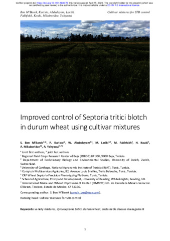 M’Barek, S. B., Karisto, P., Abdedayem, W., Laribi, M., Fakhfakh, M., Kouki, H., Mikaberidze, A. and Yahyaoui, A. (2020) Improved control of Septoria tritici blotch in durum wheat using cultivar mixtures. Plant Pathology, 69 (9). pp. 1655-1665. ISSN 0032-0862 doi: 10.1111/ppa.13247