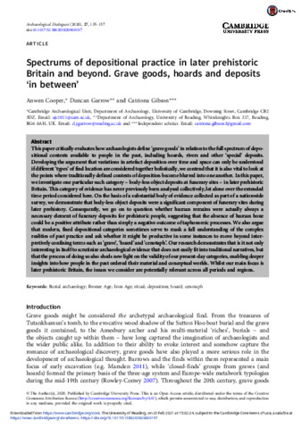 This paper critically evaluates how archaeologists define ‘grave goods’ in relation to the full spectrum of depositional contexts available to people in the past, including hoards, rivers and other ‘special’ deposits. Developing the argument that variations in artefact deposition over time and space can only be understood if different ‘types’ of finds location are considered together holistically, we contend that it is also vital to look at the points where traditionally defined contexts of deposition become blurred into one another. In this paper, we investigate one particular such category – body-less object deposits at funerary sites – in later prehistoric Britain. This category of evidence has never previously been analysed collectively, let alone over the extended time period considered here. On the basis of a substantial body of evidence collected as part of a nationwide survey, we demonstrate that body-less object deposits were a significant component of funerary sites during later prehistory. Consequently, we go on to question whether human remains were actually always a necessary element of funerary deposits for prehistoric people, suggesting that the absence of human bone could be a positive attribute rather than simply a negative outcome of taphonomic processes. We also argue that modern, fixed depositional categories sometimes serve to mask a full understanding of the complex realities of past practice and ask whether it might be productive in some instances to move beyond interpretatively confining terms such as ‘grave’, ‘hoard’ and ‘cenotaph’. Our research demonstrates that is it not only interesting in itself to scrutinise archaeological evidence that does not easily fit into traditional narratives, but that the process of doing so sheds new light on the validity of our present-day categories, enabling deeper insights into how people in the past ordered their material and conceptual worlds. Whilst our main focus is later prehistoric Britain, the issues we consider are potentially relevant across all periods and regions.