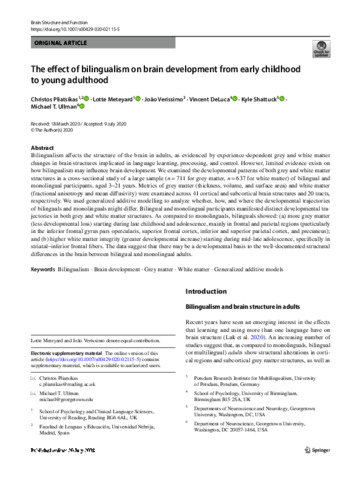 Pliatsikas, C. orcid id iconORCID: https://orcid.org/0000-0001-7093-1773, Meteyard, L. orcid id iconORCID: https://orcid.org/0000-0003-1184-1908, Veríssimo, J., DeLuca, V. orcid id iconORCID: https://orcid.org/0000-0002-2275-209X, Shattuck, K. orcid id iconORCID: https://orcid.org/0000-0002-9227-4134 and Ullman, M. T. orcid id iconORCID: https://orcid.org/0000-0001-9037-3537 (2020) The effect of bilingualism on brain development from early childhood to young adulthood. Brain Structure and Function, 225. pp. 2131-2152. ISSN 1863-2661 doi: 10.1007/s00429-020-02115-5