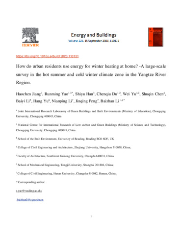 Jiang, H., Yao, R. orcid id iconORCID: https://orcid.org/0000-0003-4269-7224, Han, S., Du, C., Yu, W., Chen, S., Li, B., Yu, H., Li, N., Peng, J. and Li, B. (2020) How do urban residents use energy for winter heating at home? A large-scale survey in the hot summer and cold winter climate zone in the Yangtze River region. Energy and Buildings, 223. 110131. ISSN 0378-7788 doi: 10.1016/j.enbuild.2020.110131