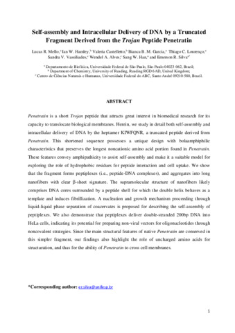 Self-assembly and intracellular delivery of DNA by a truncated fragment derived from the Trojan peptide Penetratin.