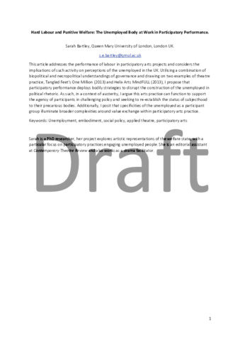 Butler, Judith. 2012. ‘Precarity Talk: A Virtual Roundtable with Lauren Berlant, Judith Butler, Bojana Cvejic, Isabell Lorey, Jasbir Puar and Ana Vujanovic.’ TDR: The Drama Review 56 (4): 163-177.