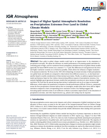 Bador, M., Boé, J., Terray, L., Alexander, L. V., Baker, A. orcid id iconORCID: https://orcid.org/0000-0003-2697-1350, Bellucci, A., Haarsma, R., Koenigk, T., Moine, M.-P., Lohmann, K., Putrasahan, D. A., Roberts, C., Roberts, M., Scoccimarro, E., Schiemann, R. orcid id iconORCID: https://orcid.org/0000-0003-3095-9856, Seddon, J., Senan, R., Valcke, S. and Vanniere, B. orcid id iconORCID: https://orcid.org/0000-0001-8600-400X (2020) Impact of higher spatial atmospheric resolution on precipitation extremes over land in global climate models. Journal of Geophysical Research: Atmospheres, 125 (3). ISSN 2169-8996 doi: 10.1029/2019jd032184