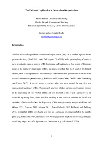 To govern effectively, international organizations (IOs) crucially depend on legitimation and support from their member states. But which states claim legitimacy for IOs, which challenge their legitimacy, and why? We address this gap in the literature by analyzing the legitimation strategies that states use in institutionalized discursive spaces within IOs. Specifically, we examine how United Nations (UN) member states seek to legitimate or delegitimate the UN Security Council in public debates in the UN General Assembly. We formulate a set of hypotheses that link specific state characteristics to evaluative statements on the Council’s legitimacy. We test these hypotheses on an original dataset using a non-linear regression model. In line with our theoretical expectations, we find that legitimation strategies are driven by a state’s membership of the Council and by its attitudes towards the United States. Contrary to our theoretical expectations, economically powerful states and states that are willing to delegate authority to supranational organizations are more likely to challenge the Council’s legitimacy. Furthermore, we provide evidence that states’ legitimacy claims resonate among fellow states, that is, among the Council’s primary audience. More generally, our findings suggest that making public claims about the Security Council’s legitimacy is not an empty diplomatic exercise, and that states do not make these claims at random. Legitimation strategies follow discernible patterns that can be explained by specific state characteristics.