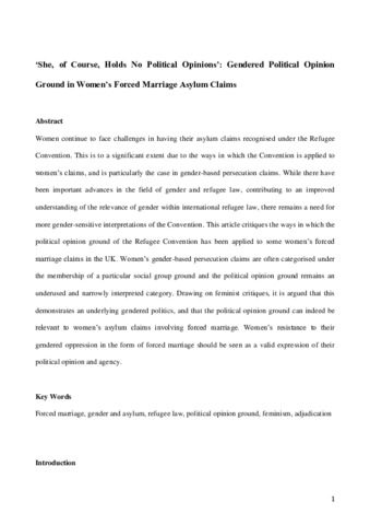 Women continue to face challenges in having their asylum claims recognized under the Refugee Convention. This is to a significant extent due to the ways in which the Convention is applied to women’s claims and is particularly the case in gender-based persecution claims. While there have been important advances in the field of gender and refugee law, contributing to an improved understanding of the relevance of gender within international refugee law, there remains a need for more gender-sensitive interpretations of the Convention. This article critiques the ways in which the political opinion ground of the Refugee Convention has been applied to some women’s forced marriage claims in the United Kingdom. Women’s gender-based persecution claims are often categorized under the membership of a particular social group ground and the political opinion ground remains an underused and narrowly interpreted category. Drawing on feminist critiques, it is argued that this demonstrates an underlying gendered politics, and that the political opinion ground can indeed be relevant to women’s asylum claims involving forced marriage. Women’s resistance to their gendered oppression in the form of forced marriage should be seen as a valid expression of their political opinion and agency.