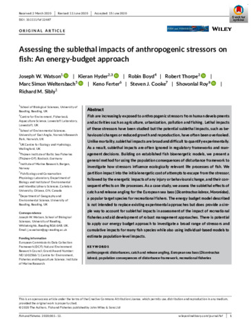 Fish are increasingly exposed to anthropogenic stressors from human developments and activities such as agriculture, urbanization, pollution and fishing. Lethal impacts of these stressors have been studied but the potential sublethal impacts, such as behavioural changes or reduced growth and reproduction, have often been overlooked. Unlike mortality, sublethal impacts are broad and difficult to quantify experimentally. As a result, sublethal impacts are often ignored in regulatory frameworks and management decisions. Building on established fish bioenergetic models we present a general method for using the population consequences of disturbance framework (PCoD) to investigate how stressors influence ecologically-relevant life processes of fish. We partition impact into the initial energetic cost of attempts to escape from the stressor, followed by the energetic impacts of any injury or behavioural change, and their consequent effects on life processes. As a case study, we assess the sublethal effects of catch and release angling for the European sea bass (Dicentrachus labrax, Moronidae), a popular target species for recreational fishers. The energy budget model described is not intended to replace existing experimental approaches but does provide a simple way to account for sublethal impacts in assessment of the impact of recreational fisheries and aid development of robust management approaches. There is potential to apply our energy budget approach to investigate a broad range of stressors and cumulative impacts for many fish species while also using individual-based models to estimate population level impacts.