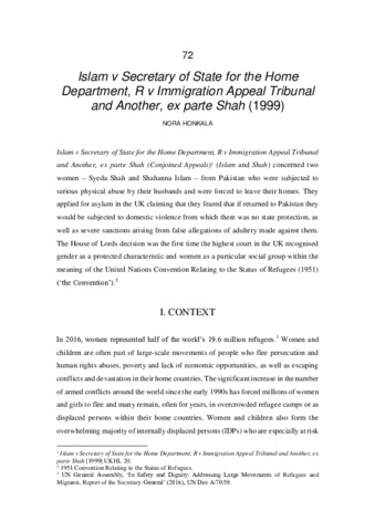 Honkala, N. orcid id iconORCID: https://orcid.org/0000-0001-9667-586X (2018) Islam v Secretary of State for the Home Department, R v Immigration Appeal Tribunal and Another, ex parte Shah (1999). In: Rackley, E. and Auchmuty, R. orcid id iconORCID: https://orcid.org/0000-0003-0792-3978 (eds.) Women's Legal Landmarks: Celebrating the history of women and law in the UK and Ireland. Hart Publishing. ISBN 9781782259770