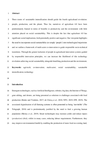 Three tenets of sustainable intensification should guide the fourth agricultural revolution: people, production, and the planet. Thus far, narratives of agriculture 4.0 have been predominately framed in terms of benefits to productivity and the environment with little attention placed on social sustainability. This is despite the fact that agriculture 4.0 has significant social implications, both potentially positive and negative. Our viewpoint highlights the need to incorporate social sustainability (or simply ‘people’) into technological trajectories and we outline a framework of multi-actor co-innovation to guide responsible socio-technical transitions. Through the greater inclusion of people in agricultural innovation systems guided by responsible innovation principles, we can increase the likelihood of this technology revolution achieving social sustainability alongside benefiting production and the environment.