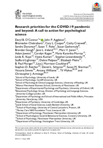 O'Connor, D. B. orcid id iconORCID: https://orcid.org/0000-0003-4117-4093, Aggleton, J. P., Chakrabarti, B. orcid id iconORCID: https://orcid.org/0000-0002-6649-7895, Cooper, C. L., Creswell, C., Dunsmuir, S., Fiske, S. T., Gathercole, S., Gough, B., Ireland, J. L., Jones, M. V., Jowett, A., Kagan, C., Karanika‐Murray, M., Kaye, L. K., Kumari, V., Lewandowsky, S., Lightman, S., Malpass, D., Meins, E., Morgan, B. P., Morrison Coulthard, L. J., Reicher, S. D., Schacter, D. L., Sherman, S. M., Simms, V., Williams, A., Wykes, T. and Armitage, C. J. (2020) Research priorities for the COVID‐19 pandemic and beyond: a call to action for psychological science. British Journal of Psychology, 111 (4). pp. 603-629. ISSN 0007-1269 doi: 10.1111/bjop.12468