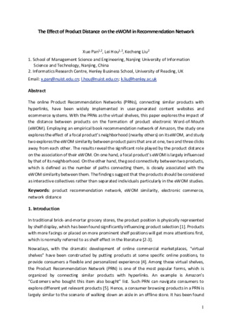 Pan, X., Hou, L. and Liu, K. (2022) The effect of product distance on the eWOM in recommendation network. Electronic Commerce Research, 22 (3). pp. 901-924. ISSN 1572-9362 doi: 10.1007/s10660-020-09432-1