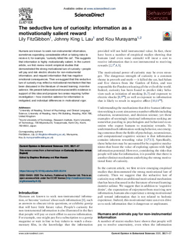Fitzgibbon, L. orcid id iconORCID: https://orcid.org/0000-0002-8563-391X, Lau, J. K. L. and Murayama, K. (2020) The seductive lure of curiosity: information as a motivationally salient reward. Current opinion in behavioural sciences, 35. pp. 21-27. ISSN 2352-1546 doi: 10.1016/j.cobeha.2020.05.014