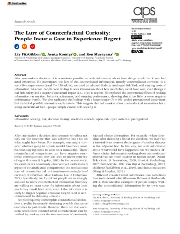 After making a decision, it is sometimes possible to seek information about how things would be if one had acted otherwise. We investigated the lure of this counterfactual information, namely counterfactual curiosity. In a set of five experiments (total N = 150) we used an adapted Balloon Analogue Risk Task with varying costs of information. People were willing to seek information about how much they could have won, at a cost, and even though it had little utility and a negative emotional impact (i.e. it led to regret). We explore the downstream effects of seeking information on emotion, behavior adjustment, and ongoing performance, showing that it has little or even negative performance benefit. We also replicated the findings with a large-sample (N = 361) preregistered experiment that excluded possible alternative explanations. This suggests that information about counterfactual alternatives has a strong motivational lure – people simply cannot help seeking it.