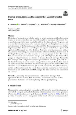 Optimal siting, sizing, and enforcement of marine protected areas.