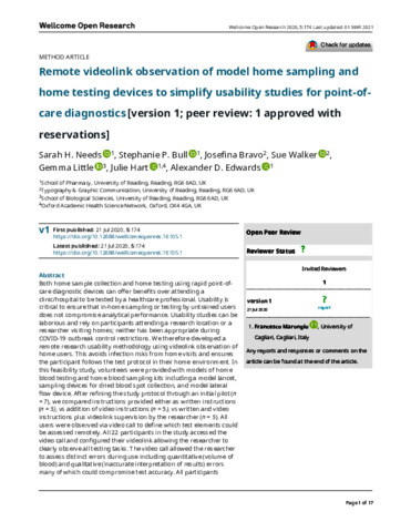 Needs, S. orcid id iconORCID: https://orcid.org/0000-0003-3407-9637, Bull, S. orcid id iconORCID: https://orcid.org/0000-0001-5129-1731, Bravo, J. orcid id iconORCID: https://orcid.org/0000-0002-1013-8412, Walker, S. orcid id iconORCID: https://orcid.org/0000-0001-5942-1836, Little, G., Hart, J. and Edwards, A. orcid id iconORCID: https://orcid.org/0000-0003-2369-989X (2020) Remote videolink observation of model home sampling and home testing devices to simplify usability studies for point-of-care diagnostics. Wellcome Open Research, 5 (174). ISSN 2398-502X doi: 10.12688/wellcomeopenres.16105.1