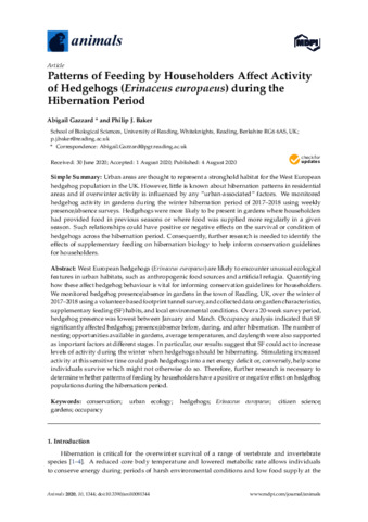 Gazzard, A. and Baker, P. J. (2020) Patterns of feeding by householders affect activity of hedgehogs (Erinaceus europaeus) during the hibernation period. Animals, 10 (8). 1344. ISSN 2076-2615 doi: 10.3390/ani10081344