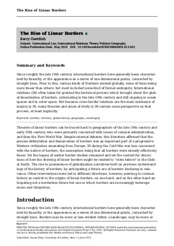Since roughly the late 19th century, international borders have generally been characterized by linearity, or the appearance as a series of one-dimensional points, connected by straight lines. Prior to this, various kinds of frontiers existed globally, some of them being more linear than others, but most included some kind of formal ambiguity. International relations (IR) often takes for granted the historical process which brought about the global linearization of borders, culminating in the late 19th century and still ongoing in ocean spaces and in outer space. But because cross-border relations are the main substance of inquiry in IR, many theories and areas of study in IR contain some perspective on that process, at least implicitly.