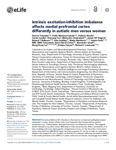 Trakoshis, S., Martínez-Cañada, P., Rocchi, F., Canella, C., You, W., Chakrabarti, B. orcid id iconORCID: https://orcid.org/0000-0002-6649-7895, Ruigrok, A. N., Bullmore, E. T., Suckling, J., Markicevic, M., Zerbi, V. orcid id iconORCID: https://orcid.org/0000-0001-7984-9565, MRC AIMS Consortium, Baron-Cohen, S., Gozzi, A., Meng-Chuan, L., Panzeri, S. and Lombardo, M. V. (2020) Intrinsic excitation-inhibition imbalance affects medial prefrontal cortex differently in autistic men versus women. eLIFE, 9. ISSN 2050-084X doi: 10.7554/eLife.55684