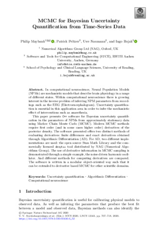 In computational neuroscience, Neural Population Models (NPMs) are mechanistic models that describe brain physiology in a range of different states. Within computational neuroscience there is growing interest in the inverse problem of inferring NPM parameters from recordings such as the EEG (Electroencephalogram). Uncertainty quantification is essential in this application area in order to infer the mechanistic effect of interventions such as anaesthesia. This paper presents Open image in new window software for Bayesian uncertainty quantification in the parameters of NPMs from approximately stationary data using Markov Chain Monte Carlo (MCMC). Modern MCMC methods require first order (and in some cases higher order) derivatives of the posterior density. The software presented offers two distinct methods of evaluating derivatives: finite differences and exact derivatives obtained through Algorithmic Differentiation (AD). For AD, two different implementations are used: the open source Stan Math Library and the commercially licenced Open image in new window tool distributed by NAG (Numerical Algorithms Group). The use of derivative information in MCMC sampling is demonstrated through a simple example, the noise-driven harmonic oscillator. And different methods for computing derivatives are compared. The software is written in a modular object-oriented way such that it can be extended to derivative based MCMC for other scientific domains.