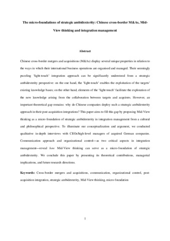 Chinese cross-border mergers and acquisitions (M&As) display several unique properties in relation to the ways in which their international business operations are organised and managed. Their seemingly puzzling ‘light-touch’ integration approach can be significantly understood from a strategic ambidexterity perspective: on the one hand, the ‘light-touch’ enables the exploitation of the targets’ existing knowledge bases; on the other hand, elements of the ‘light-touch’ facilitate the exploration of the new knowledge arising from the collaboration between targets and acquirers. However, an important theoretical gap remains: why do Chinese companies deploy such a strategic ambidexterity approach in their post-acquisition integrations? This paper aims to fill this gap by proposing Mid-View thinking as a micro-foundation of strategic ambidexterity in integration management from a cultural and philosophical perspective. To illuminate our conceptualization and argument, we conducted qualitative in-depth interviews with CEOs/high-level managers of acquired German companies. Communication approach and organizational control—as two critical aspects in integration management—reveal how Mid-View thinking can serve as a micro-foundation of strategic ambidexterity. We conclude this paper by presenting its theoretical contributions, managerial implications, and future research directions.