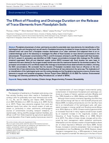 Kelly, T. J., Hamilton, E., Watts, M. J., Ponting, J. and Sizmur, T. orcid id iconORCID: https://orcid.org/0000-0001-9835-7195 (2020) The effect of flooding and drainage duration on the release of potentially toxic elements from floodplain soils. Environmental Toxicology and Chemistry, 39 (11). pp. 2124-2135. ISSN 0730-7268 doi: 10.1002/etc.4830