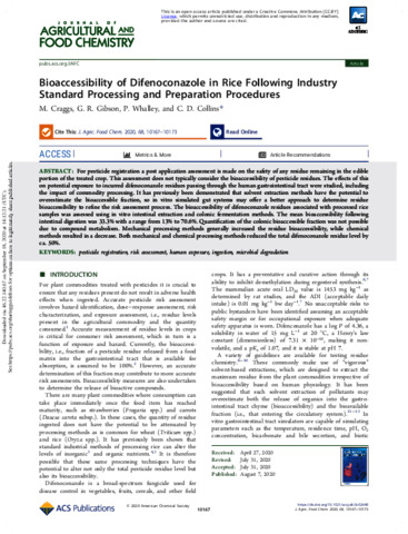 For pesticide registration a post application assessment is made on the safety of any residue remaining in the edible portion of the treated crop. This assessment does not typically consider the bioaccessibility of pesticide residues. The effects of this on potential exposure to incurred difenoconazole residues passing through the human gastrointestinal tract was studied, including the impact of commodity processing. It has previously been demonstrated that solvent extraction methods have the potential to overestimate the bioaccessible fraction, so in vitro simulated gut systems may offer a better approach to determine residue bioaccessibility to refine the risk assessment process. The bioaccessibility of difenoconazole residues associated with processed rice samples were assessed using in vitro intestinal extraction and colonic fermentation methods. Mean bioaccessibility following intestinal digestion was 33.3% with a range of 13% to 70.6%. Quantification of the colonic bioaccessible fraction was not possible due to compound metabolism. Mechanical processing methods generally increased the residue bioaccessibility while chemical methods resulted in a decrease. Both mechanical and chemical processing methods reduced the total difenoconazole residue level by c. 50%. M. 1, G.R Gibson2, P. Whalley1, C.D Collins3*