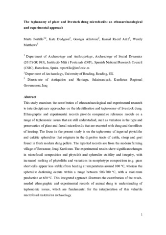 This study examines the contribution of ethnoarchaeological and experimental research to interdisciplinary approaches on the identification and taphonomy of livestock dung. Ethnographic and experimental records provide comparative reference models on a range of taphonomic issues that are still understudied, such as variation in the type and preservation of plant and faecal microfossils that are excreted with dung and the effects of heating. The focus in the present study is on the taphonomy of ingested phytoliths and calcitic spherulites that originate in the digestive tracts of cattle, sheep and goat found in fresh modern dung pellets. The reported records are from the modern farming village of Bestansur, Iraqi Kurdistan. The experimental results show significant changes in microfossil composition and phytolith and spherulite stability and integrity, with increased melting of phytoliths and variations in morphotype composition (e.g. grass short cells appear less stable) from heating at temperatures around 800 ºC, whereas the spherulite darkening occurs within a range between 500-700 ºC, with a maximum production at 650 ºC. This integrated approach illustrates the contribution of the much-needed ethnographic and experimental records of animal dung to understanding of taphonomic issues, which are fundamental for the interpretation of this valuable microfossil material in archaeology.