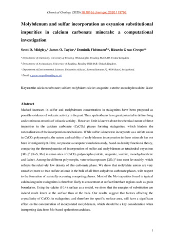 Balan, E., Blanchard, M., Pinilla, C. and Lazzeri, M. (2014) First-principles modeling of sulfate incorporation and 34S/32S isotopic fractionation in different calcium carbonates. Chemical Geology 374-375, 84-91.