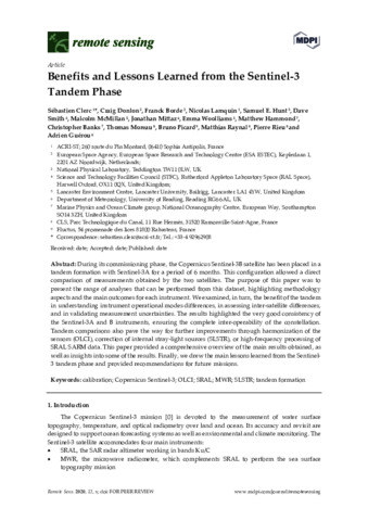 Clerc, S., Donlon, C., Borde, F., Lamquin, N., Hunt, S., Smith, D., McMillan, M., Mittaz, J., Woolliams, E., Hammond, M., Banks, C., Moreau, T., Picard, B., Raynal, M., Rieu, P. and Guerou, A. (2020) Benefits and lessons learned from the Sentinel-3 tandem phase. Remote Sensing, 12 (17). 2668. ISSN 2072-4292 doi: 10.3390/rs12172668