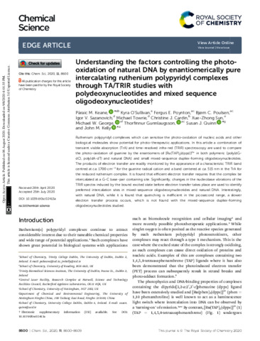 Understanding the factors controlling the photo-oxidation of natural DNA by enantiomerically pure intercalating ruthenium polypyridyl complexes through TA/TRIR studies with polydeoxynucleotides and mixed sequence oligodeoxynucleotides.