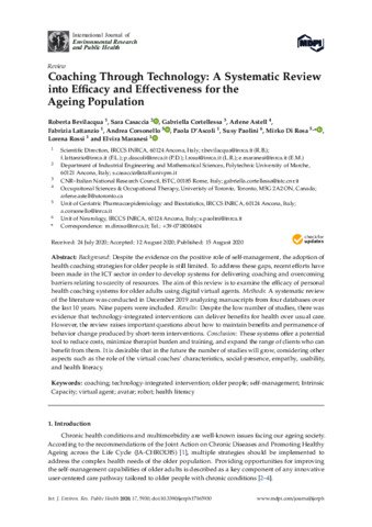 Bevilacqua, R., Casaccia, S., Cortellessa, G., Astell, A. orcid id iconORCID: https://orcid.org/0000-0002-6822-9472, Lattanzio, F., Corsonello, A., D'Ascoli, P., Paolini, S., Di Rosa, M., Rossi, L. and Maranesi, E. (2020) Coaching through technology: a systematic review into efficacy and effectiveness for the ageing population. International Journal of Environmental Research and Public Health, 17 (16). 5930. ISSN 1660-4601 doi: 10.3390/ijerph17165930