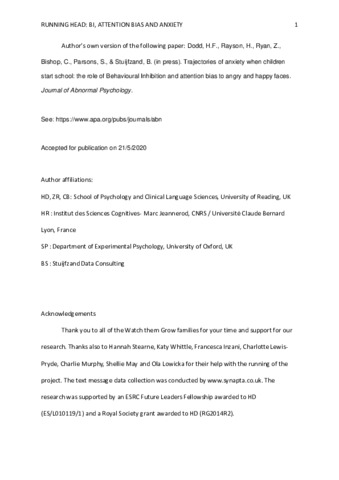 Trajectories of anxiety when children start school: the role of behavioural inhibition and attention bias to angry and happy faces.