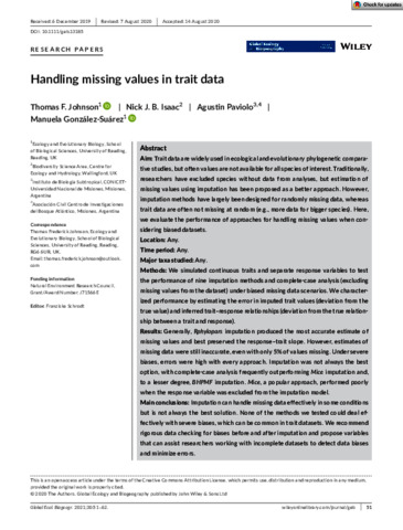 Johnson, T. F., Isaac, N. J. B., Paviolo, A. and Gonzalez-Suarez, M. orcid id iconORCID: https://orcid.org/0000-0001-5069-8900 (2020) Handling missing values in trait data. Global Ecology and Biogeography, 30 (1). pp. 51-62. ISSN 1466-8238 doi: 10.1111/geb.13185
